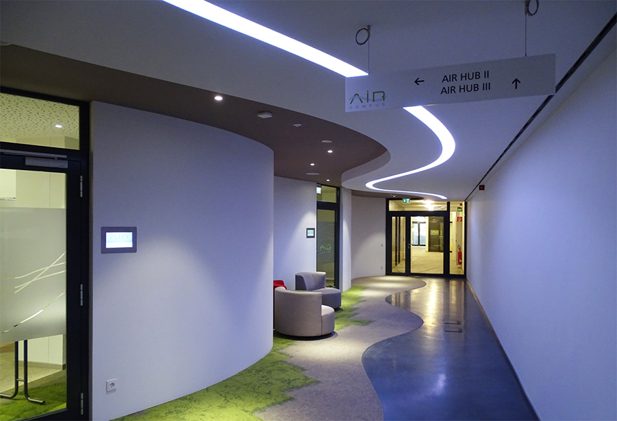 Im Industriegebiet Nordostpark von Nürnberg, in unmittelbarer Nähe zur Autobahn und Flughafen, wurde mit dem Air Campus ein außergewöhnliches Umfeld für innovatives Arbeiten realisiert. Forschungseinrichtungen, Technikunternehmen und Start-Ups finden hier optimale Bedingungen für kreatives und erfolgreiches Arbeiten. Sowohl die Einzel-, Gruppen- oder Großraumbüros als auch die Besprechungs- und Konferenzräume sind technisch und gestalterisch up-to-date.
