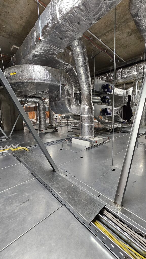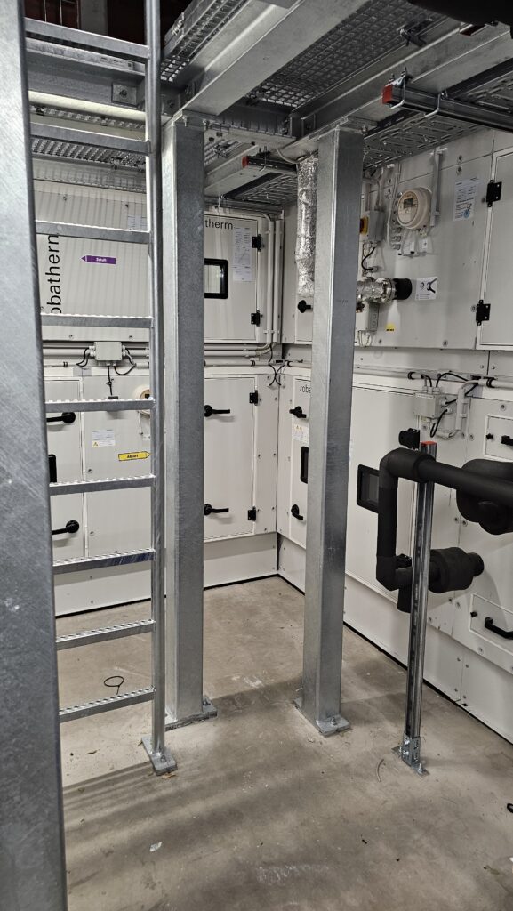 Eine besondere Herausforderung: der Technikraum mit nur 28 m²!  Unsere Lösung? Eine dreistöckige RLT-Anlage mit einer Luftleistung von 6.500 m³/h, die alle Luftbehandlungsfunktionen vereint. Dazu eine zweite begehbare Ebene, um Wartung und weitere technische Komponenten wie das Hochleistungs-Kreislaufverbundsystem (HKVS) optimal unterzubringen.