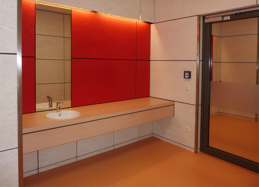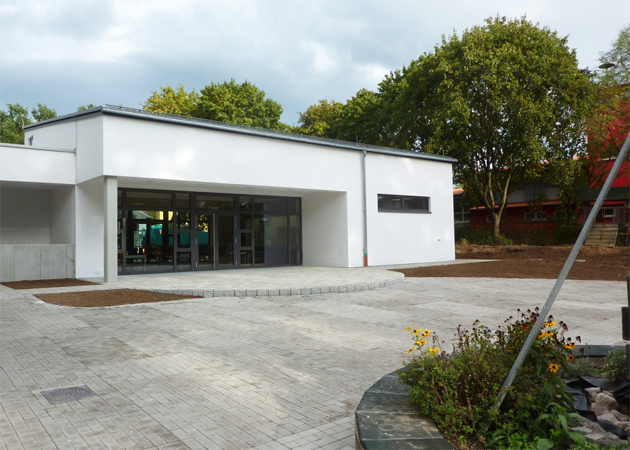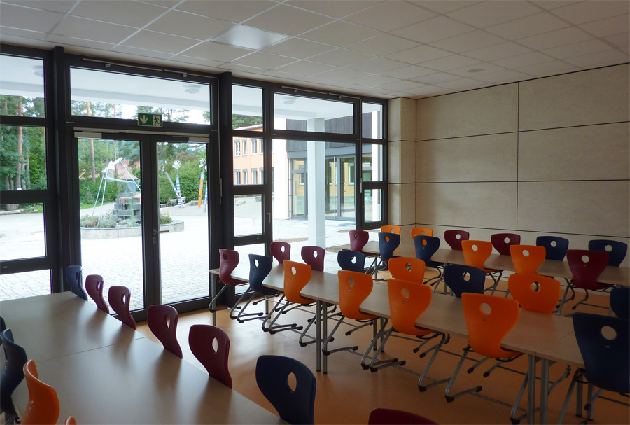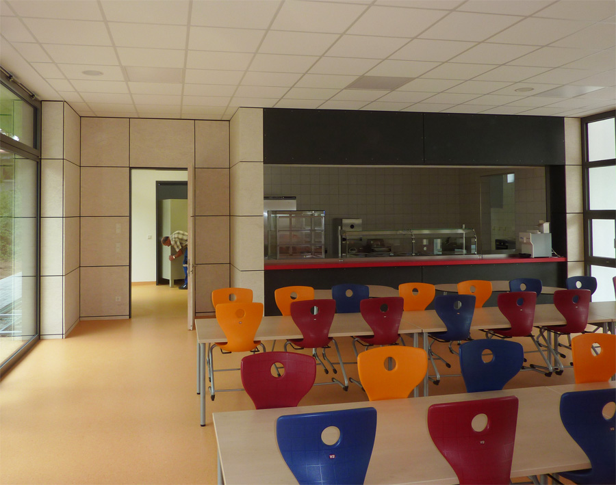 Hell, modern, kind- und vor allem behindertengerecht präsentiert sich die neue Mensa an der Grund- und Mittelschule in Mühlhausen. Neben den 160 qm im Erdgeschoss hat das Gebäude noch einen 130 qm großen Keller. Besonderes Augenmerk wurde auf den Brandschutz und die behindertengerechte Ausstattung gelegt. So wurden z.B. die sanitären Anlagen barrierefrei angelegt und ein Aufzug zu den Klassenzimmern im oberen Stockwerk installiert.
