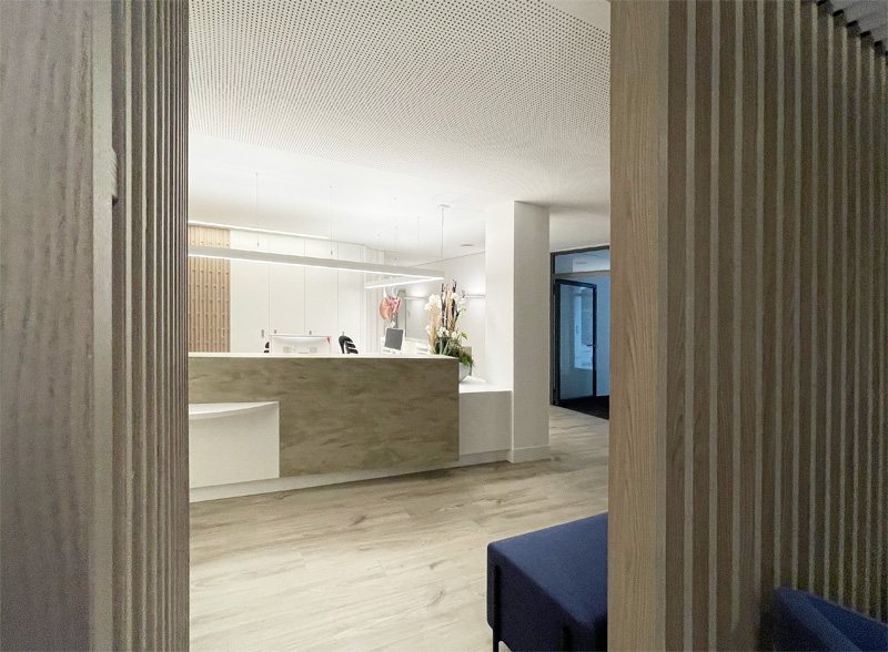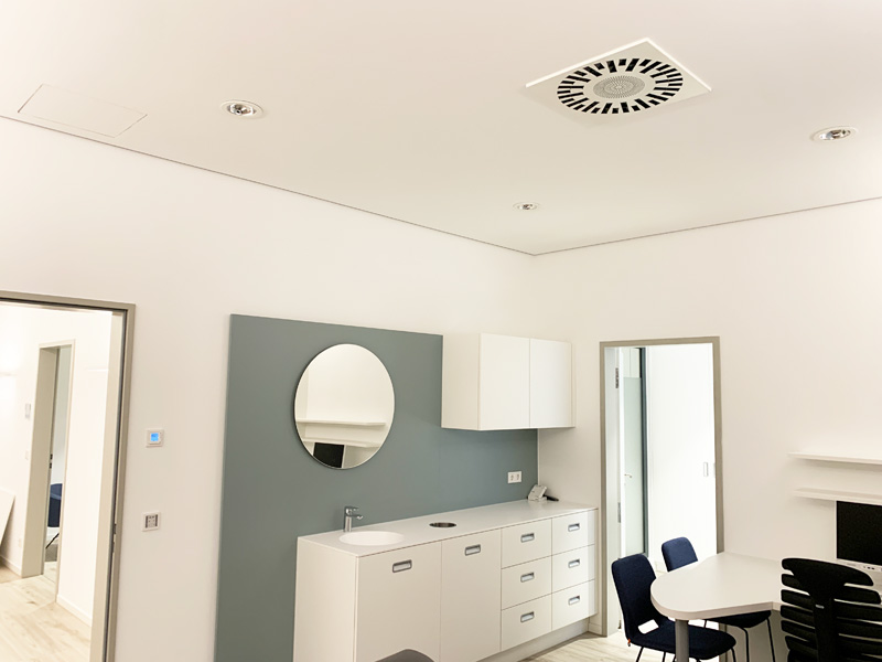 Bei dem Bestandsgebäude in der historischen Innenstadt Nürnbergs handelt es sich um ein Büro- und Geschäftshaus, das umfassend saniert und renoviert wurde. Im Bereich der Fußgängerzone, in der Findelgasse, wurde eine Erweiterung der Praxis Pränatal, einer Praxis für Pränatalmedizin sowie Gynäkologie und Gentechnik, realisiert. Auf einer Fläche von über 500m² entstanden weitere Behandlungsräume, sowie Labor und Ärztezimmer mit höchsten Ansprüchen an Raumluftqualität und Behaglichkeit. Hierfür wurden alle Behandlungszimmer mit kombinierten Zu- und Abluft-Deckenauslässen ausgestattet, über die standardmäßig die Grundlüftung erfolgt. Nach einem Patientenwechsel kann hier per Knopfdruck die Hygienelüftung aktiviert werden. Diese gewährleistet den Austausch der gesamten Raumluft in wenigen Minuten. Um den Patienten einem Maximum an Behaglichkeit zu gewährleisten, erfolgt die Heizung und Kühlung über Deckenplatten.