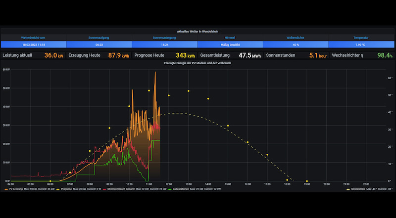 Der erzeugte Gleichstrom wird über zwei Wechselrichter mit Nennleistungen von 60 kW bzw. 20 kW in netzkonformen Wechselstrom umgewandelt. Für die Einspeisevergütung und Netzanbindung war die Abstimmung eines geeigneten Energie-Messkonzepts mit dem zuständigen Energieversorgungsunternehmen (EVU) erforderlich. Das umgesetzte Konzept entspricht dem Modell der „Überschusseinspeisung mit Erzeugungsmessung“.