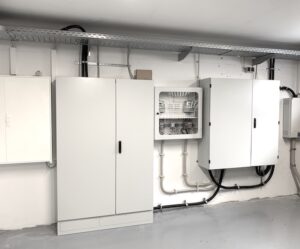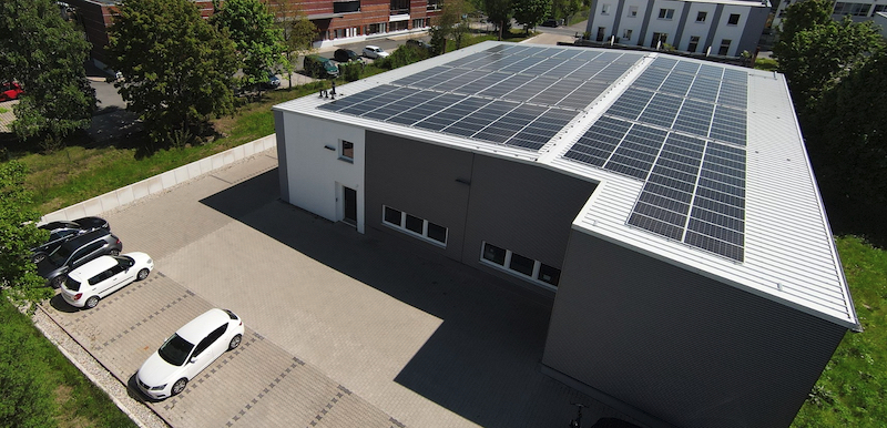 Anfang Mai 2021 begannen die ersten Installationsarbeiten unserer Photovoltaikanlage mit einer Nennleistung von 99,2 kWp. Die Ausführung erfolgte als Aufdachanlage in Kurzschienenmontage auf dem Flachdach der Halle mit angeschlossenem Bürogebäude. Insgesamt wurden 320 monokristalline PV-Module mit jeweils 310 W Maximalleistung installiert.