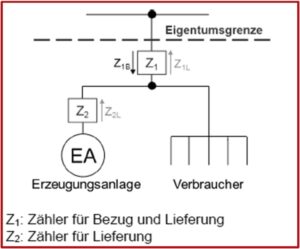 Im Rahmen dieses Konzepts sind zwei Zählpunkte erforderlich. Der erste Messpunkt wird durch einen Zweirichtungszähler („Z1“) realisiert, der sowohl die aus dem Netz bezogene Energie als auch die eingespeiste Überschussenergie erfasst.